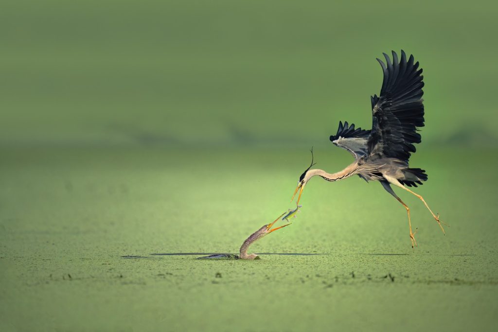 Por categoria, o Fotografo do Ano em Vida Selvagem Fotógrafo do foi o indiano Baiju Patil com a imagem “O Roubo Perfeito”, que ele descreve asssim: “Há mais de 15 anos que volto aos pântanos de Bharatpur, mas em 2024 foi um momento único. A proliferação de algas impulsionou a população de peixes, atraindo anhingas e garças-reais para pescaria. Num roubo relâmpago, uma garças-real arrebatou no ar o peixe de uma anhinga. Depois de anos de paciência, finalmente consegui capturar essa disputa que sempre acontece”.